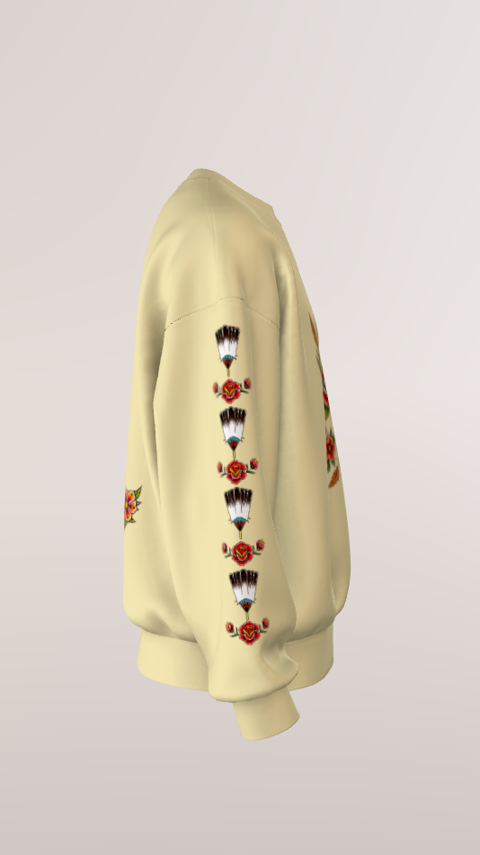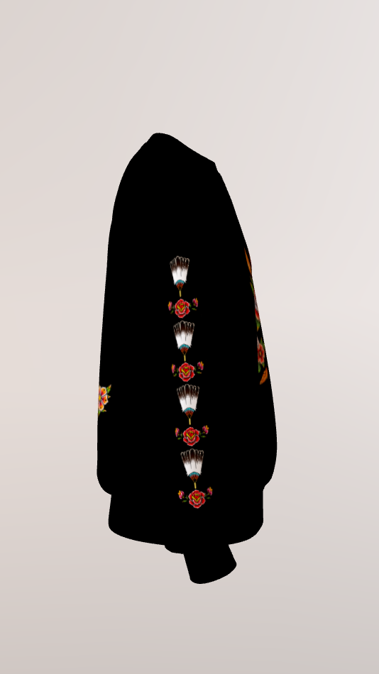 ​Unique Sleeve Print: The arms feature a vertical repeating motif of roses and the feather fan, ensuring your style makes an impact from every angle.